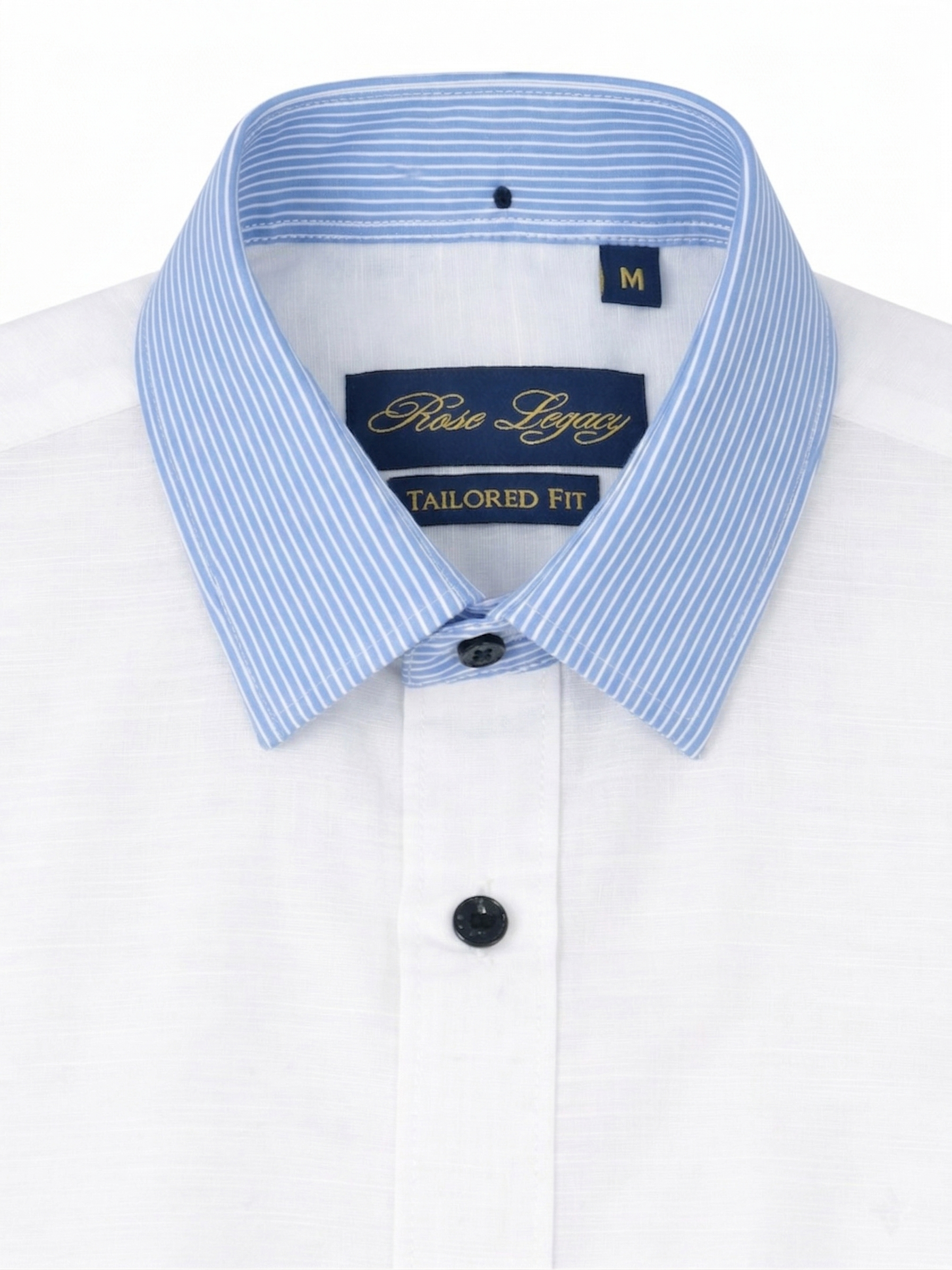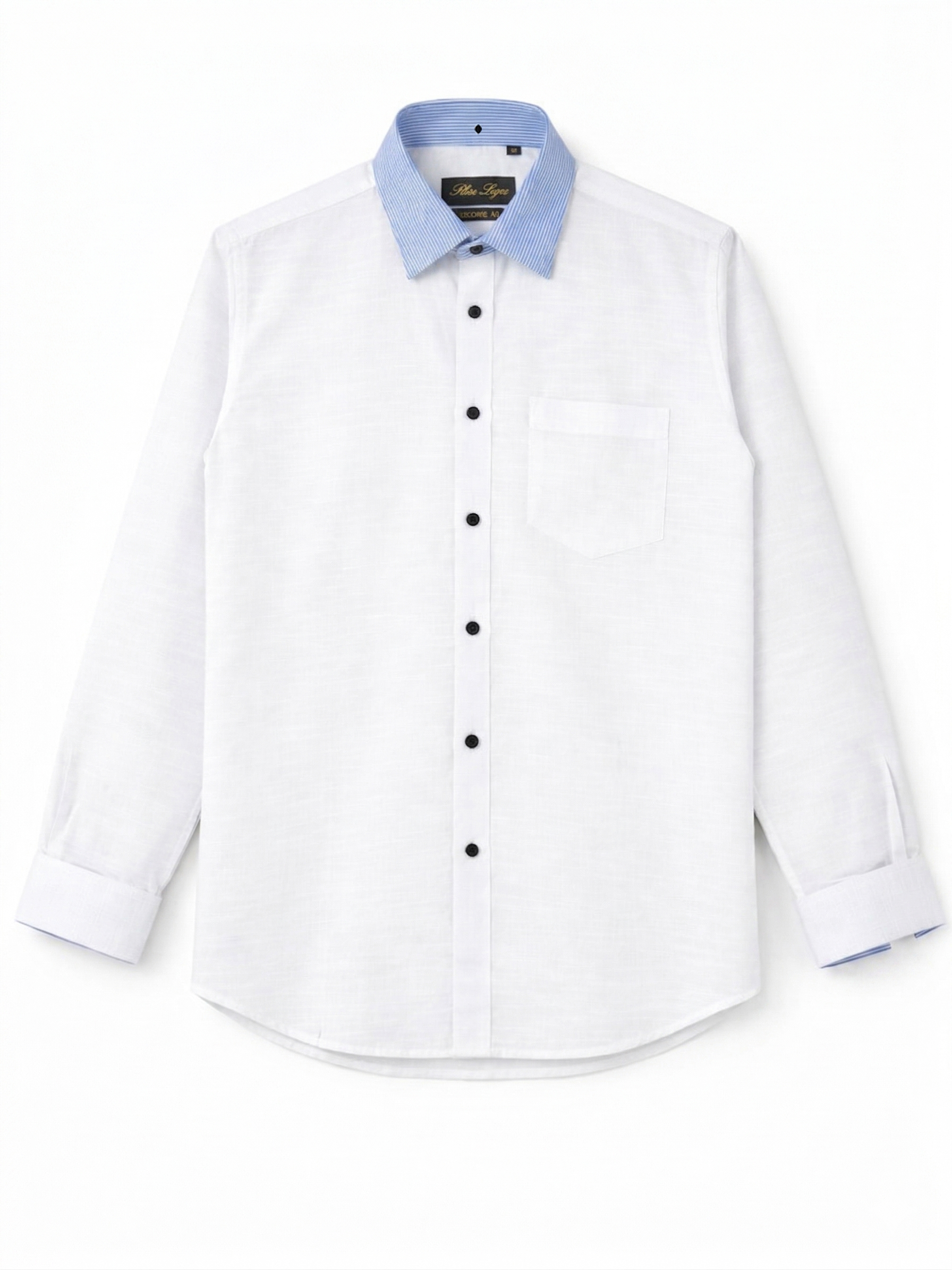 Embrace refined elegance with this premium white dress shirt, designed with a distinctive blue striped inner collar for a modern contrast. Crafted from high-quality cotton, this shirt combines comfort, durability, and timeless style.